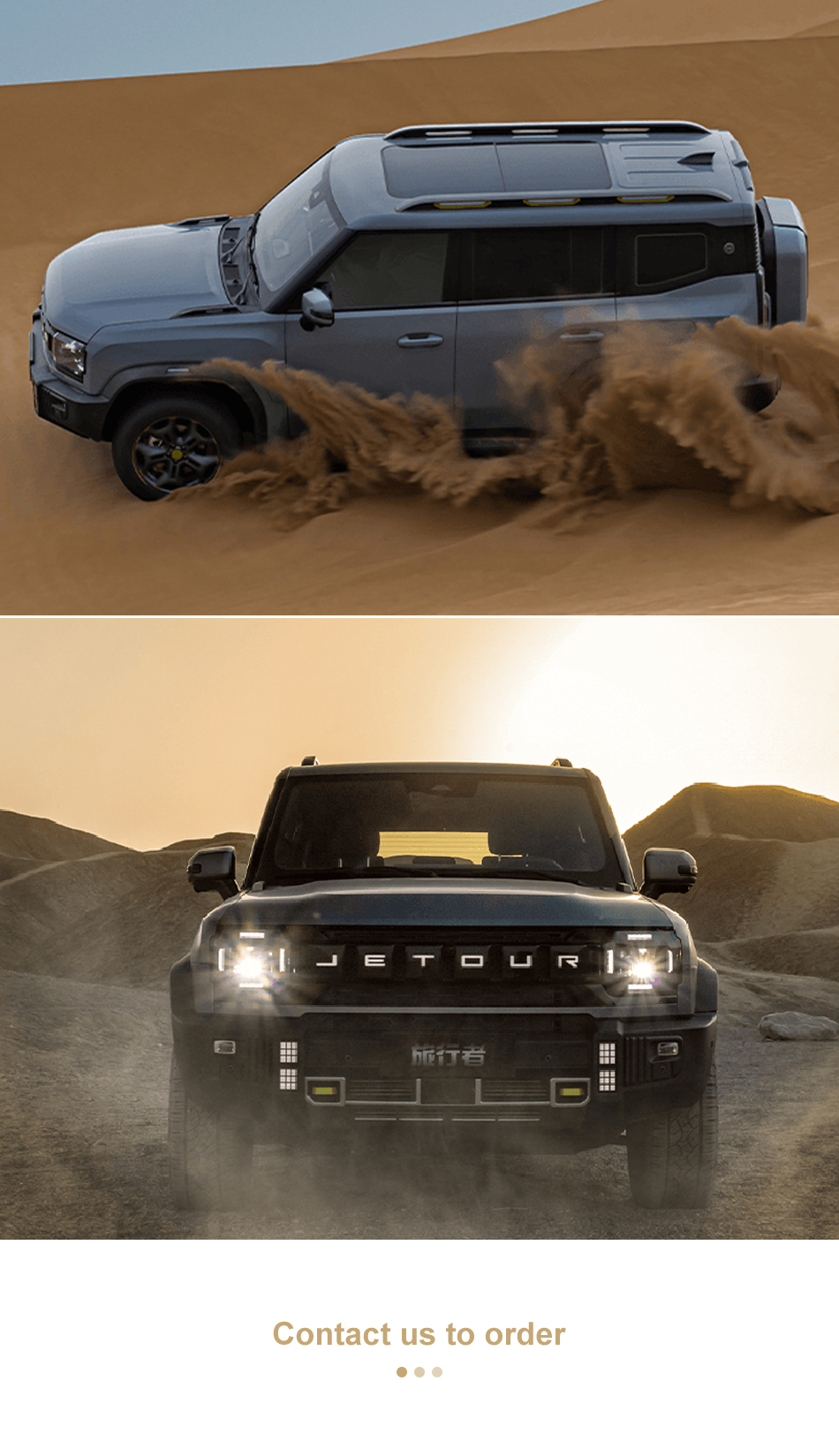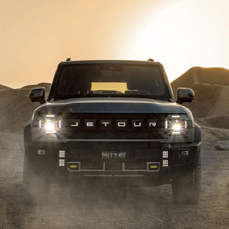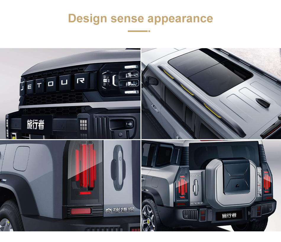 Adopting a square shape, the front face is a smoked black honeycomb shaped air intake grille with adaptive full LED headlights. There are 6 black square decorative panels with the "JETOUR" English logo in the center of the front grille, and it supports breathing light function. Four LED auxiliary lighting lights are integrated on both sides of the front bumper. The side profile of the car is a "square box" shape, with raised lines on the front and rear wheel arches and under the doors, providing 19 inch wheels and optional 20 inch wheels. The rear of the car adopts a vertical layout of left and right tail lights, with a high mounted brake light above the rear windshield. The rear tailgate is designed with a side opening, equipped with an external storage bag and an electric suction door. The rear bumper uses a rugged off-road kit.