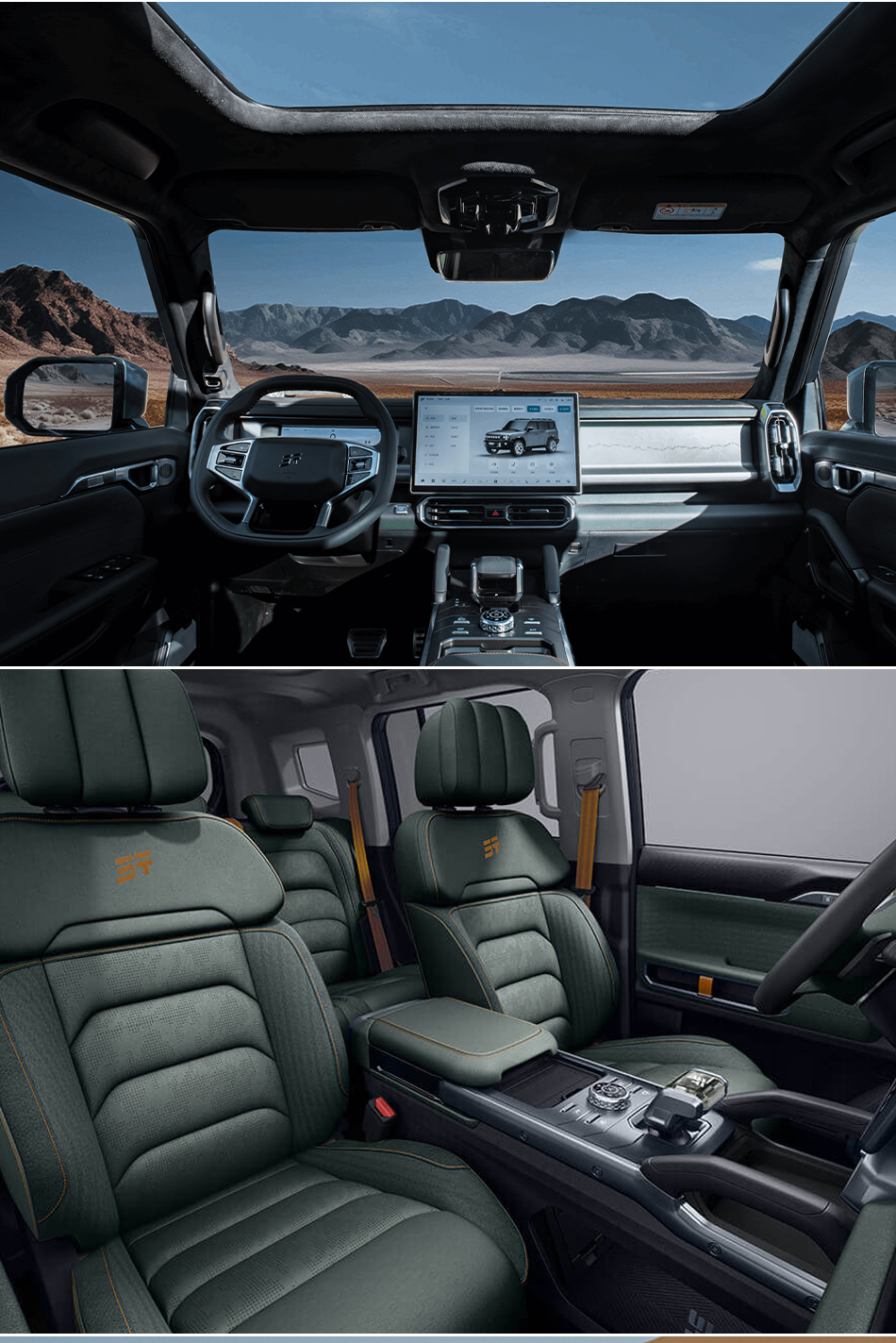 The center console is equipped with a four spoke flat bottomed steering wheel, a 10.25-inch LCD instrument panel, a 15.6-inch floating central control screen, and an electronic gear shifting mechanism. There is a 50W wireless charging panel for mobile phones in front of the gear lever, and integrated physical function buttons and four-wheel drive system switching knob at the rear. Provide intelligent car infotainment system, L2 level assisted driving, 360 degree panoramic imaging+180 degree transparent chassis, active safety warning system, built-in driving recorder, front multi-layer soundproof glass, multi-color ambient lighting, in car fragrance system and other configurations. The seats adopt a 5-seat layout, wrapped in faux leather material. The driver's seat has electric adjustment, ventilation, and memory functions, and the rear seats support a 4/6 fold down ratio.